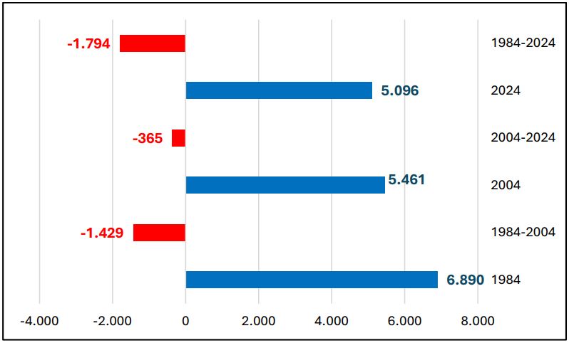 Negli ultimi quarant’anni il patrimonio residenziale gestito in locazione da Ater nel Comune di Venezia ha subito un forte ridimensionamento: era formato da 6.890 alloggi nel 1984, si è ridotto a 5.096 alloggi nel 2024. (1)