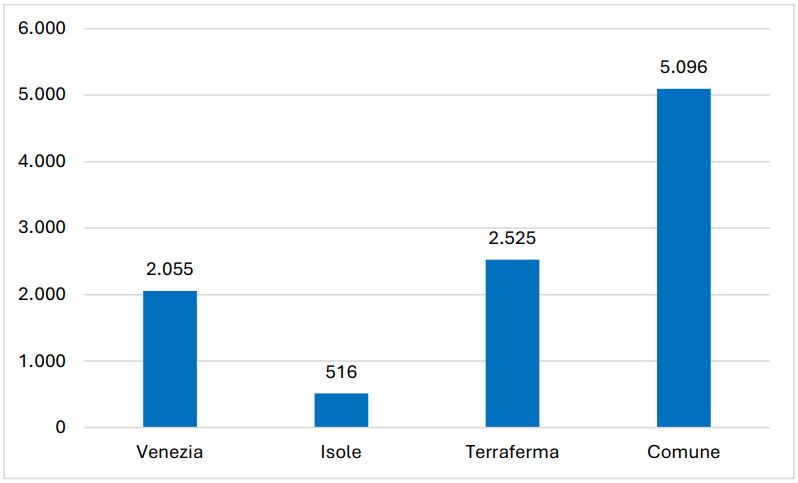 Al 31 dicembre 2024 Ater amministra nel Comune di Venezia 5.096 alloggi di sua proprietà, equamente suddivisi tra Venezia insulare e Terraferma Veneziana.