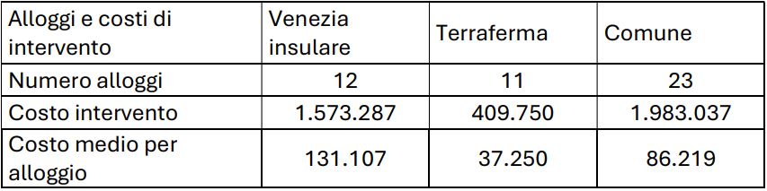 Facendo un rapido calcolo, la previsione per il Comune di Venezia è di un costo medio di intervento di 20 mila euro per alloggio, di gran lunga inferiore sia alle stime del presidente Ater, che agli importi degli interventi in corso al 31.12.2024.