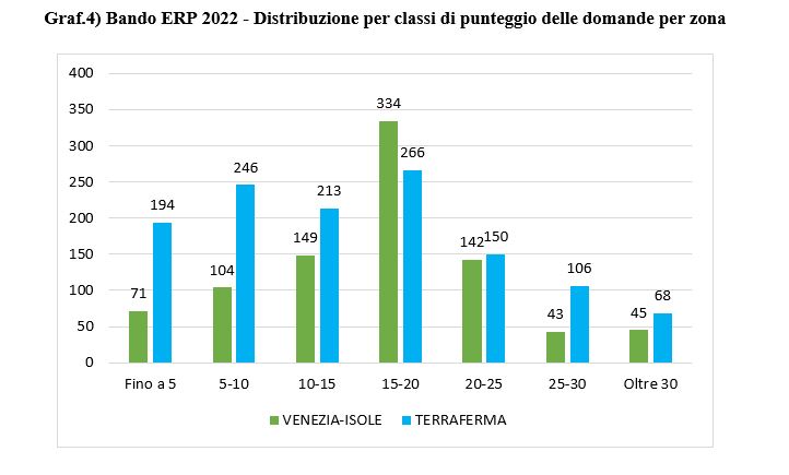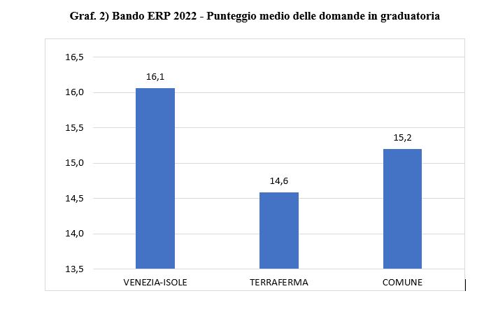 Nel Comune, il punteggio medio di graduatoria è pari 15,2 punti, che salgono a 16,1 nella graduatoria della Venezia insulare e si attestano a 14,6 nella Terraferma veneziana.