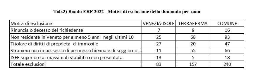 La sorpresa maggiore è costituita dai motivi di esclusione, che in tre anni cambiano radicalmente: l’ISEE elevata o non presentata, che rappresentava nel 2019 quasi la totalità dei motivi di esclusione, nell’ultima graduatoria provvisoria è motivo di esclusione solo di 18 domande ed è abbondantemente superata dalla mancanza del requisito della residenza in Veneto del richiedente da almeno 5 anni, anche non consecutivi, negli ultimi 10 (93 casi),[2] da richiedenti di nazionalità straniera non in possesso di permesso di soggiorno almeno biennale (80 casi, concentrati in Terraferma), ma anche da richiedenti già proprietari di un’abitazione adeguata alle esigenze familiari.