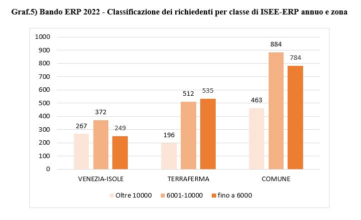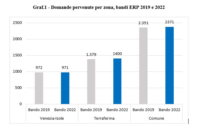 In seguito all’emanazione, nel 2022, del nuovo bando per l’assegnazione di alloggi di Edilizia Residenziale Pubblica (ERP), sono pervenute al comune 2.371 domande, 971 nell’ambito territoriale di Venezia e Isole e 1.400 in quello della Terraferma veneziana, numeri leggermente superiori a quelli delle domande presentate al bando 2019, sia in valore assoluto, sia rispetto alle famiglie residenti nelle diverse zone del comune. [1]