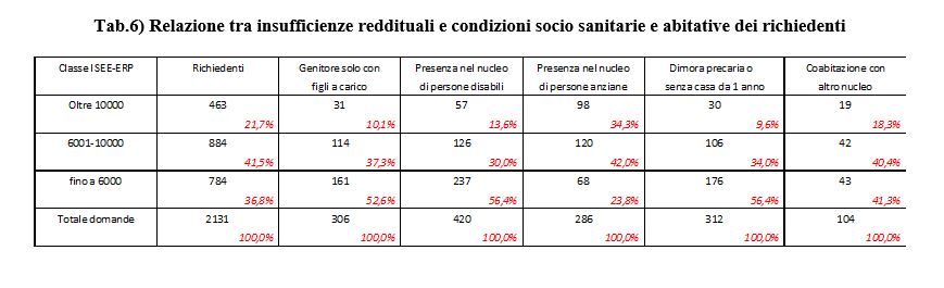 Le condizioni socio sanitarie e abitative peggiorano sensibilmente in funzione dell’ISEE-ERP del nucleo: il 53% dei nuclei formati da un solo genitore con figli a carico, o con presenza di disabilità o handicap hanno un’ISEE-ERP inferiore ai 6.000 euro.