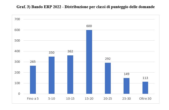 A livello comunale, il 28,2% delle domande si colloca nella fascia centrale di punteggio, tra i 15 e i 20 punti; poco meno della metà delle domande, il 47%, ottiene meno di 15 punti; una domanda su quattro si posizione nelle fasce medio alta e alta, oltre i 20 punti.