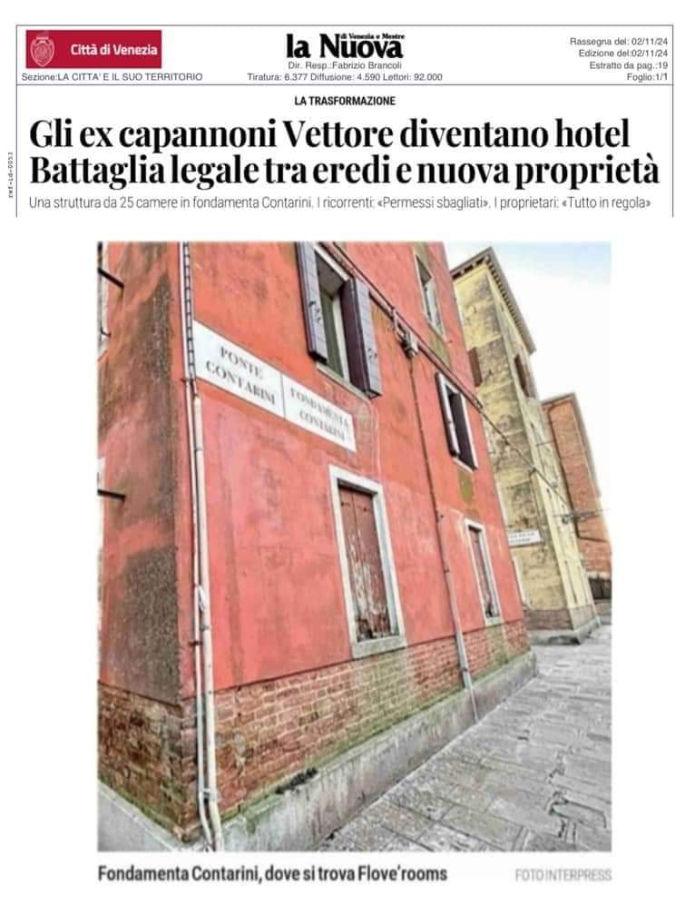 In un articolo della Nuova Venezia a firma di Alberto Vitucci del novembre 2024 leggiamo di Flovè Rooms, un complesso alberghiero recentemente aperto a San Girolamo (sestiere di Cannaregio) al posto degli ex capannoni Vettore.