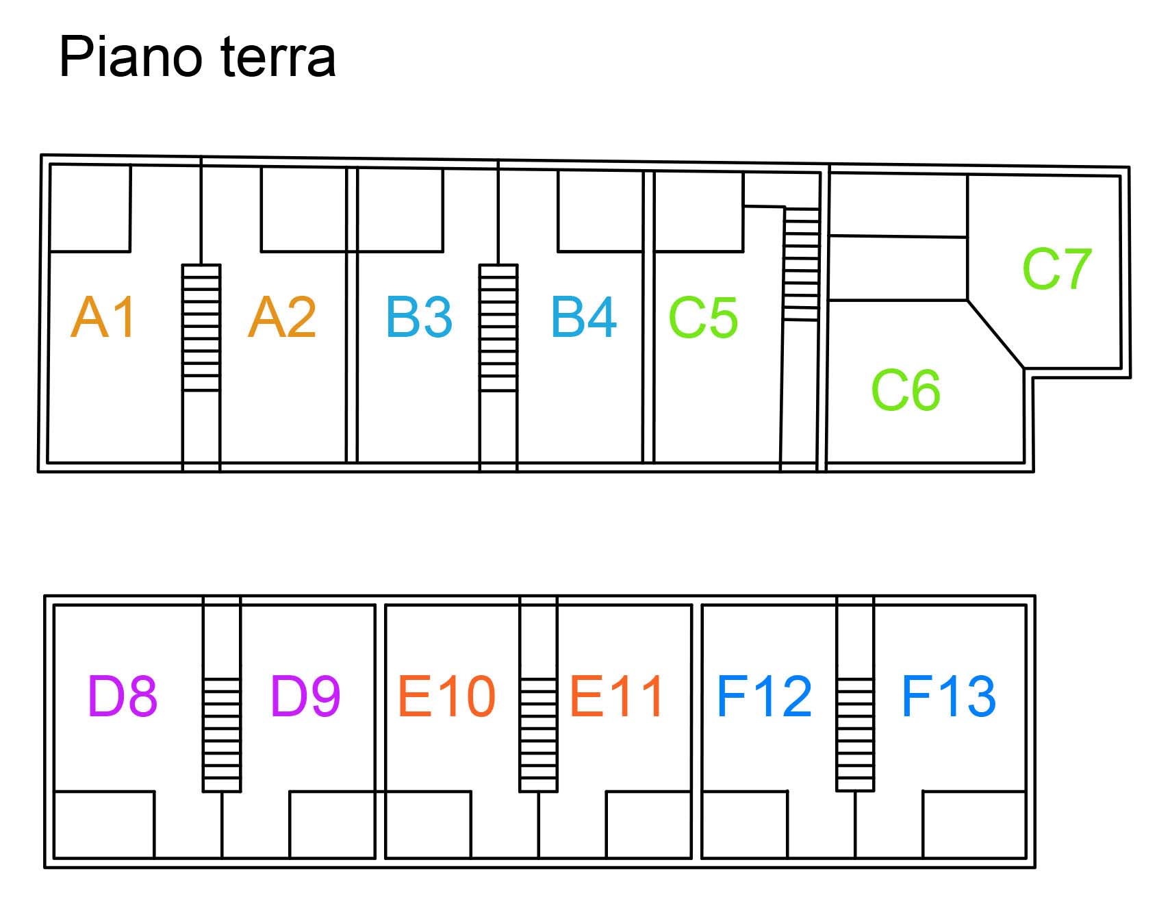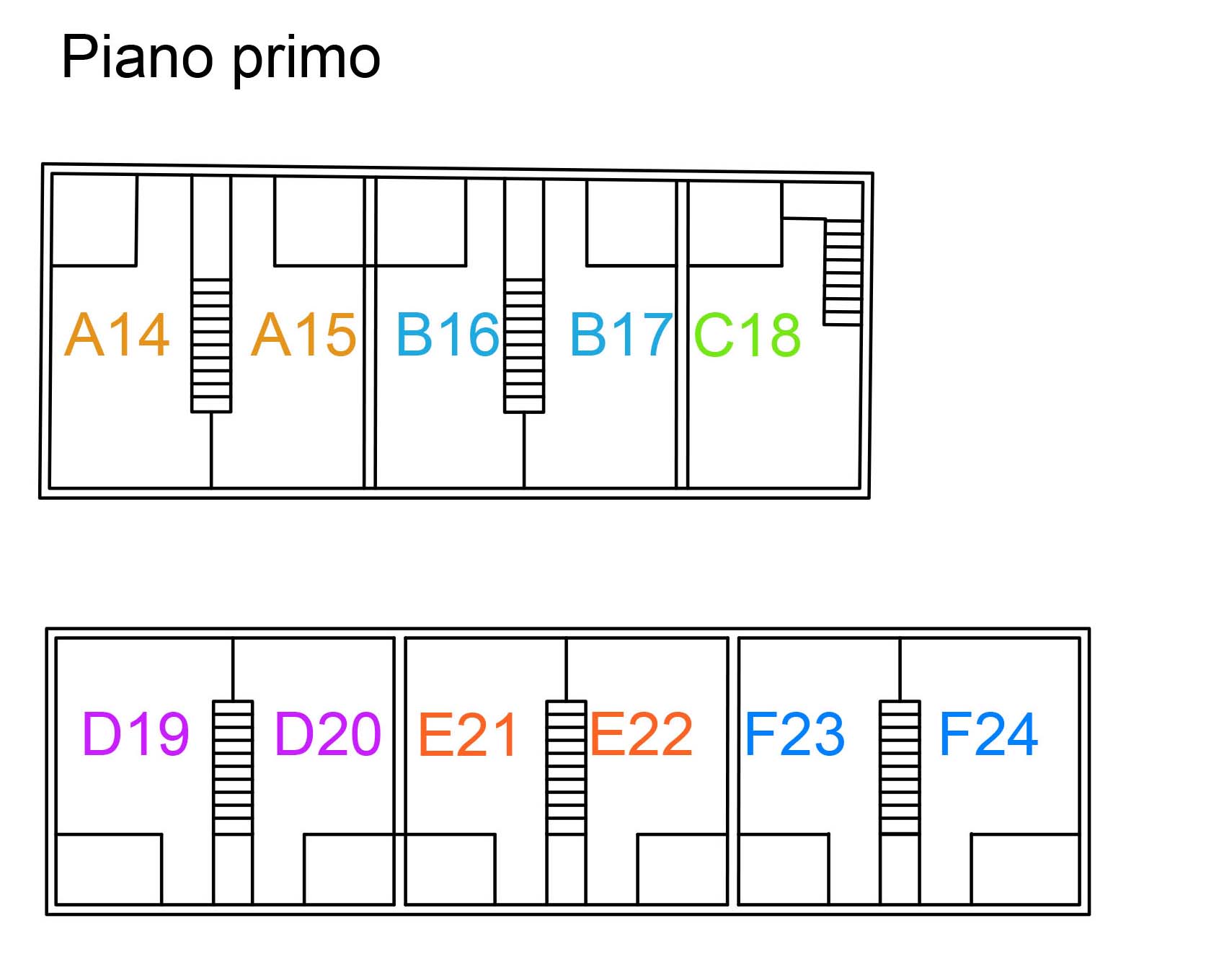 Qui possiamo verificare che ci sono effettivamente sei appartamenti e come sono divisi. Si tratta chiaramente di duplex, dunque di appartamenti su due livelli. La pianta tipo è composta da una scala centrale con due camere ai lati.