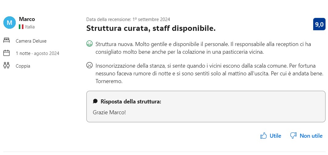 - In molte delle recensioni si parla di reception, del puntuale cambio delle lenzuola e della straordinaria gentilezza di Luca e di Viviana. Ricordiamo che le LT non prevedono la fornitura di servizi aggiuntivi come la reception o la pulizia quotidiana delle camere.
