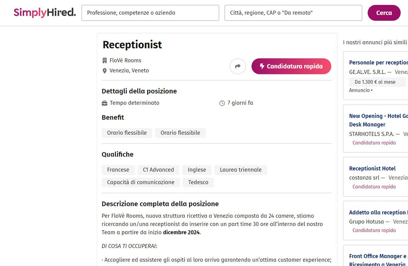 C’è anche un’offerta di lavoro per receptionist, nella quale il numero di camere è indicato in 24.