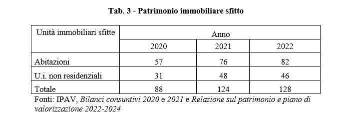 Tra il 2020 e il 2022 il patrimonio immobiliare di IPAV rimane invariato, ma le abitazioni sfitte - senza contratto di locazione - crescono di 25 unità, passando da 57 a 82. Nello stesso periodo i fabbricati non residenziali inoccupati, dopo un forte incremento tra il 2020 e il 2021, nel 2022 si mantengono sostanzialmente stabili.