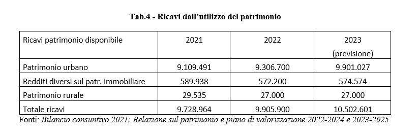 I ricavi provenienti dalla locazione del patrimonio immobiliare ammontavano al 31.12 2022 a poco meno di 10 milioni di euro, in aumento rispetto al 2021e con una previsione per il 2023 di un ulteriore crescita a 10,5 milioni, fondata sui rinnovi dei contratti commerciali e sulle gare per l’assegnazione di alcuni immobili a destinazione sia abitativa che commerciale.