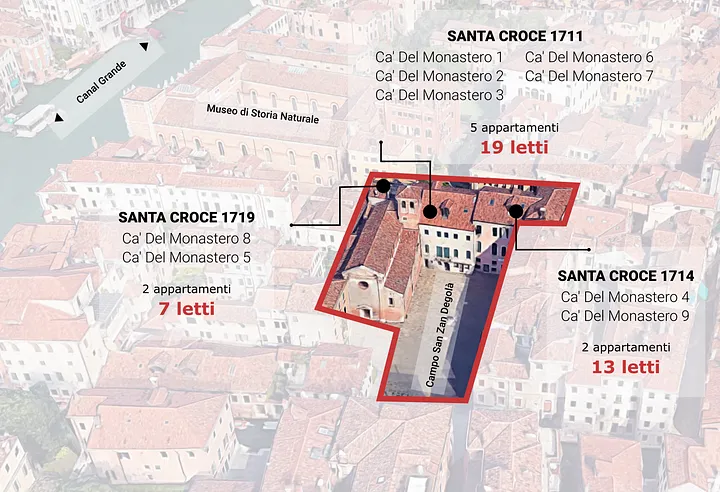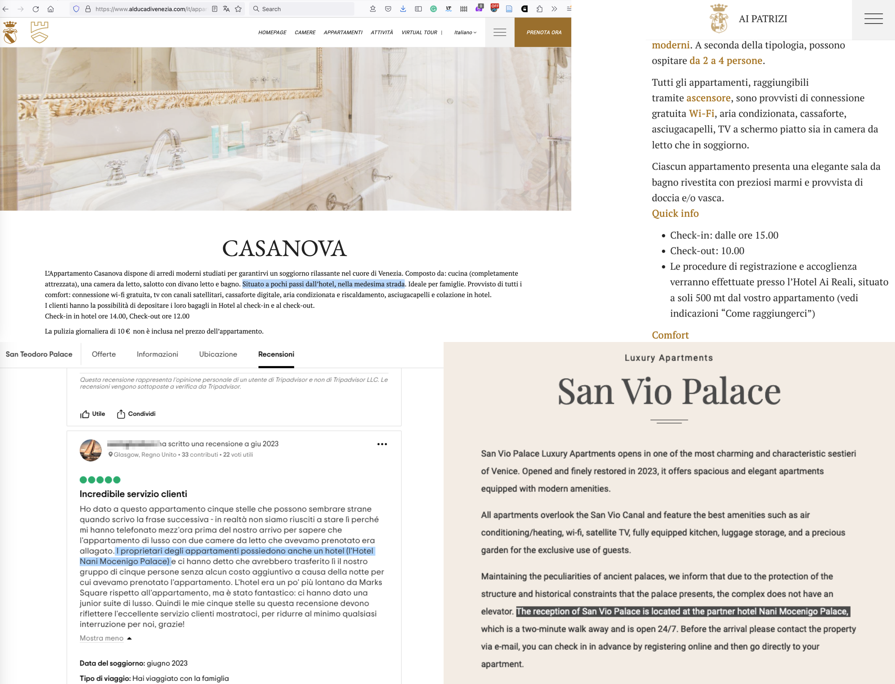 È il 2007. L’Università Ca’ Foscari vende lo storico Palazzo Nani Mocenigo (in fondamenta San Trovaso), sede della facoltà di Filosofia, a Fox srl. Il rettore dell’Ateneo precisa che non ci sono le caratteristiche per destinare l’edificio ad attività ricettiva. Passa qualche anno ed è la Soprintendenza a sancire il cambio di destinazione d’uso: Palazzo Nani Mocenigo diventa un hotel. La nuova struttura ricettiva, a giudicare dai siti web e dalla società che li gestisce, è collegata ad altri hotel veneziani: Hotel ai Reali (nell’ex sede del TAR in Campo della Fava), Hotel ai Cavalieri (Palazzo Papadopoli Friedenberg), e Hotel al Duca (nei pressi di Campo San Giacomo de l’Orio). Appartengono al gruppo anche due strutture extralberghiere: Al Bailo (Palazzina Buttaro, bene pubblico alienato nel 2007 e acquistato da una società, almeno fino al 2019, legata a quella che ora gestisce tutti i siti web delle strutture qui menzionate) e Al Redentore (nell’isola della Giudecca). Ma se siamo qui a parlare di questo gruppo di alberghi, è perché vi rientrano anche 12 appartamenti “Ai Patrizi” (50 posti letto), 13 appartamenti del “San Teodoro Palace” (50 posti letto), 6 appartamenti del “San Vio Palace” (33 posti letto) e la “Suite Casanova” (4 posti letto): tutti in regime di locazione turistica. Questi appartamenti sono di fatto gestiti come un’estensione degli hotel del gruppo, al punto che agli ospiti viene suggerito di passare alla reception dell'Hotel Reali (Ai Patrizi) o dell’Hotel Nani Mocenigo (San Teodoro Palace) per il check-in - come dichiarato nel sito stesso delle due strutture e come lamentato da molti turisti nelle recensioni fornite sui portali di Booking. La “Suite Casanova”, nonostante sia una locazione turistica appartenente a un edificio distinto, sul sito è invece pubblicizzata come parte dell’Hotel al Duca.