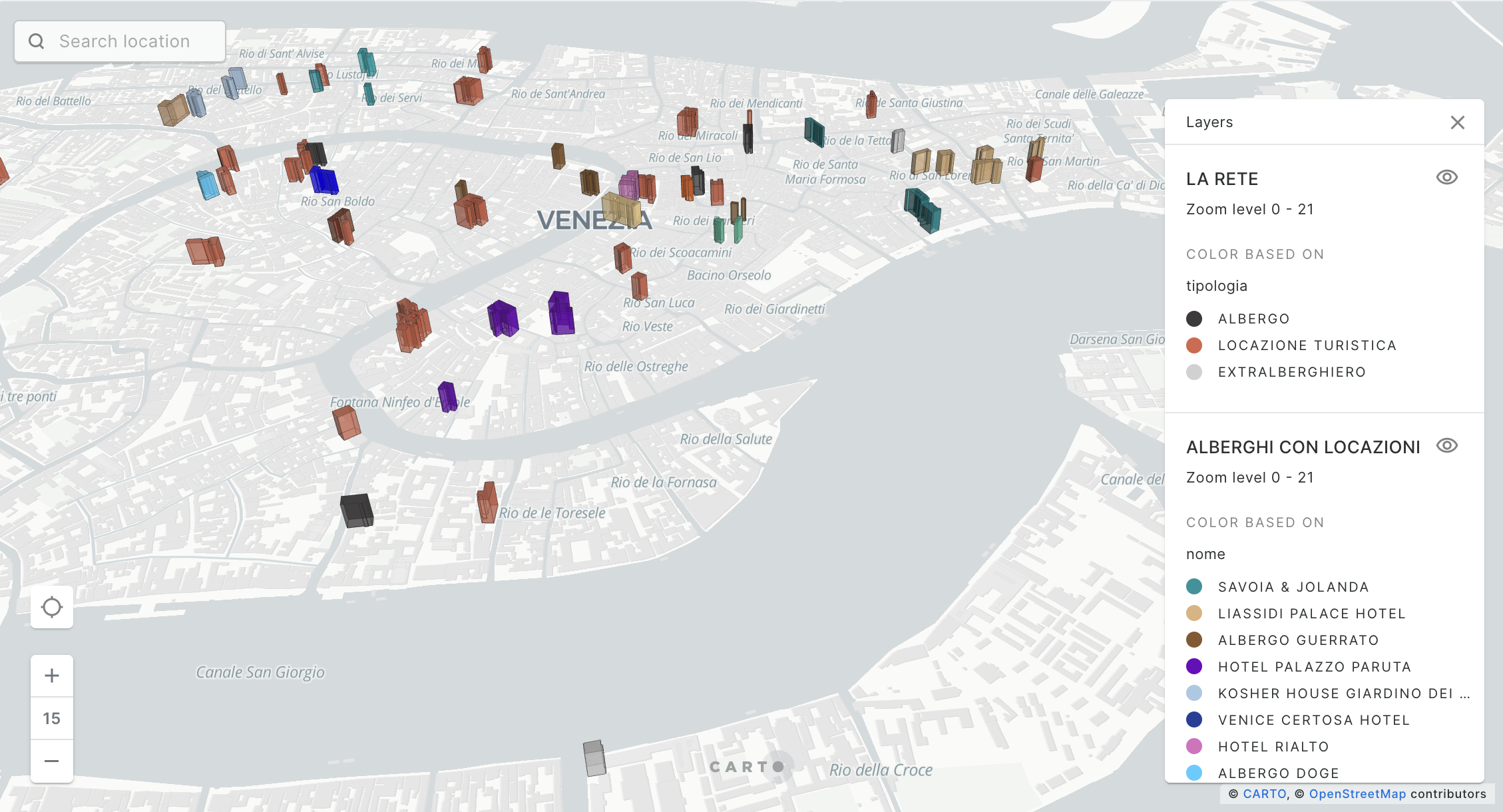 Se nella categoria precedente rientrano gli alberghi che si espandono in punti diversi della città grazie alle locazioni turistiche, qui parliamo di un fenomeno per certi versi opposto: locazioni turistiche concentrate in un singolo palazzo o in più palazzi circostanti che di fatto fungono da albergo, pur non essendo formalmente (e fiscalmente) attività ricettive alberghiere. Anche in questo caso non si tratta di nulla di illegale nella forma, sebbene nella sostanza avvenga anche qui una trasformazione della natura residenziale di interi immobili. È difficile sapere esattamente quanti sono: presso l’Ufficio Tributi sono segnalati 3.948 diversi civici nel Centro Storico di Venezia aventi almeno una locazione turistica. Di questi, 1.070 ne hanno almeno due e 84 ne hanno più di 5. Scoprire il proprietario o gestore di ciascuna, trattandosi di un dato non diffuso pubblicamente, è impossibile. Inoltre dobbiamo tenere presente che:
