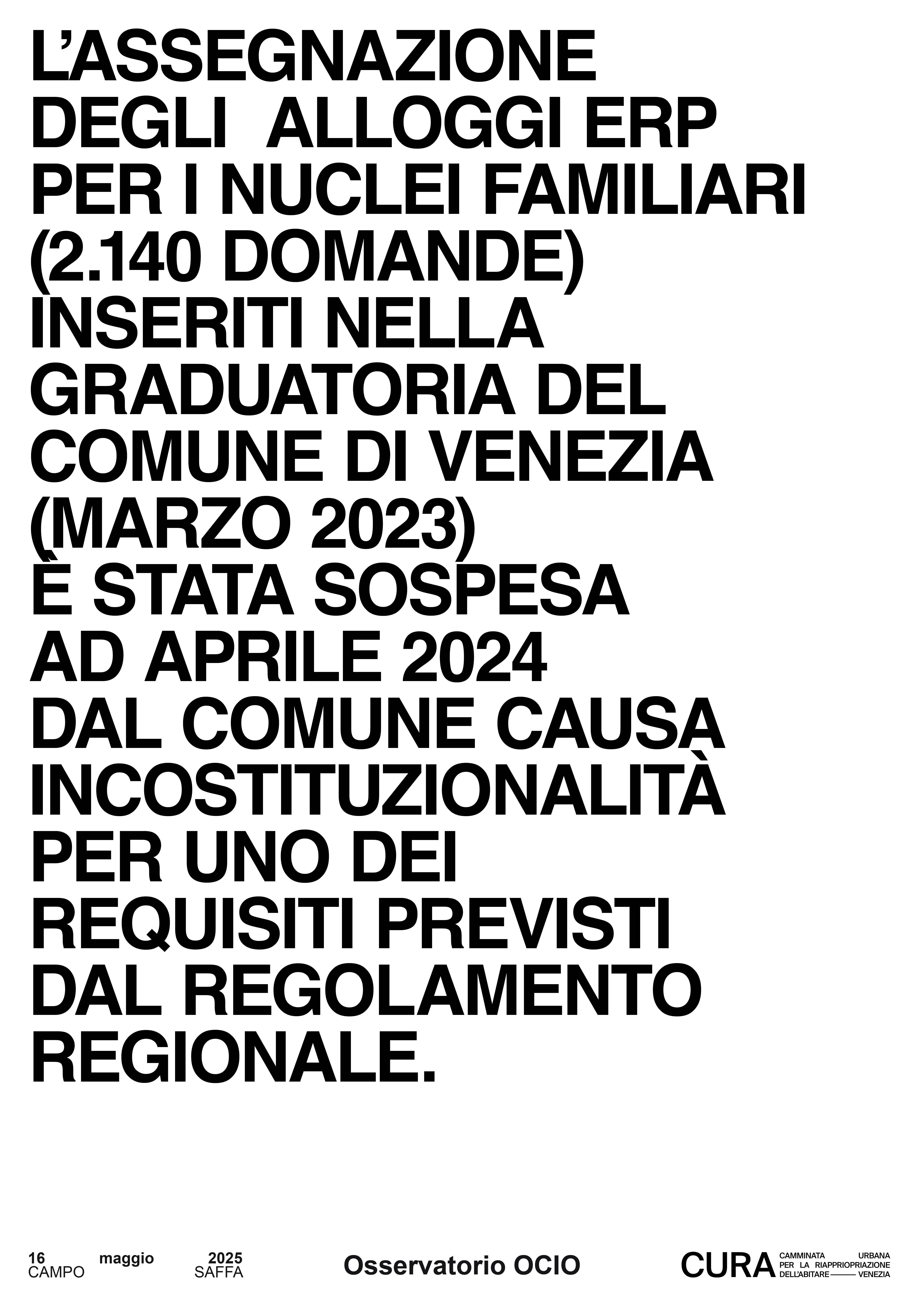 Quella del 12 novembre 2022 è la quinta C.U.R.A. proposta da OCIO dopo quelle organizzate rispettivamente alla Giudecca (maggio 2019), e poi a Castello (ottobre 2019), a Dorsoduro (ottobre 2020, incentrata sull’area di Santa Marta) e a Cannaregio (maggio 2021).TAPPA A. ERP (Edilizia Residenziale Pubblica) a San PoloLe abitazioni di Edilizia Residenziale Pubblica localizzate nel sestiere di S. … ▶ Continua a leggere -