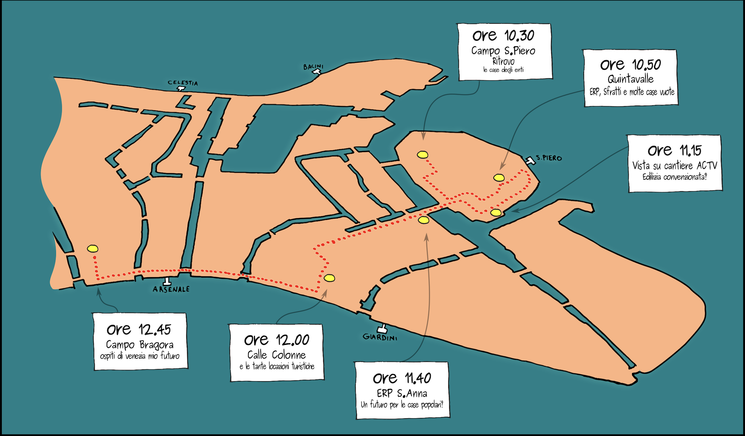 Una Camminata Urbana di Riappropriazione dell’Abitare per CannaregioCamminare insieme attraverso i sestieri, uno dopo l’altro, per aprire gli occhi sui luoghi dell’abitare a Venezia; è un po’ questo il proposito di queste passeggiate. Dopo la Giudecca, Castello (rispettivamente a maggio e a ottobre 2019) e Dorsoduro (ottobre 2020), ora è il turno di Cannaregio, il più popolato -- 14.704 residenti … ▶ Continua a leggere -