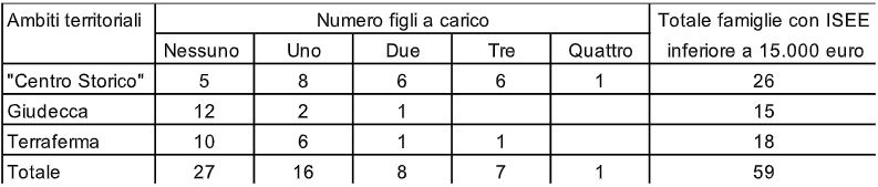 Rispetto agli altri ambiti territoriali, la Terraferma si caratterizza per l’alto numero di nuclei familiari con figli a carico, poco meno della metà, e di quelli con un indicatore Isee inferiore a 15.000 euro, che coinvolge l’80% dei nuclei e rappresenta la condizione di punteggio più frequente.