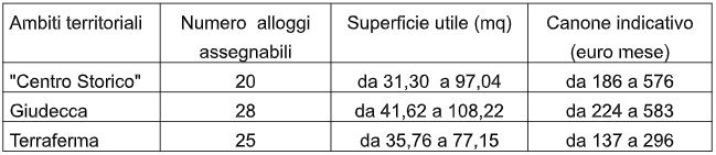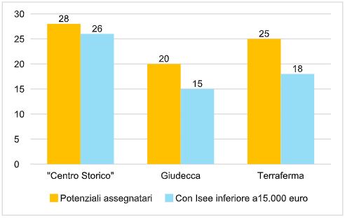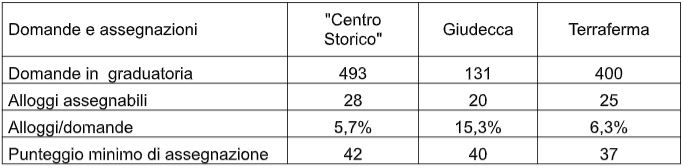 Considerando i canoni richiesti per gli alloggi assegnabili, specie per quelli di medio-grandi dimensioni ubicati nella Venezia insulare, dove le richieste superano abbondantemente i 500 euro mensili, risulta evidente la loro scarsa coerenza con le condizioni socio economiche dei potenziali assegnatari.
