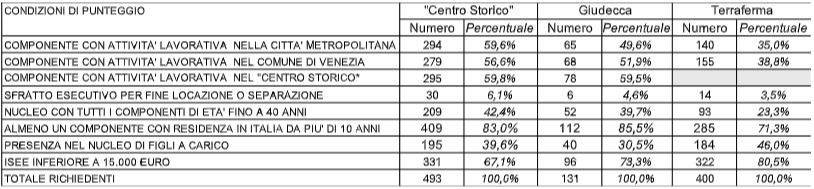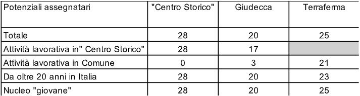 E infatti, tranne rarissime eccezioni, i nuclei dei potenziali assegnatari (3) hanno l’attività lavorativa nella Città Metropolitana di Venezia; in “Centro Storico” - se richiedenti nella Venezia insulare - o nel Comune, se la domanda è per un alloggio in Terraferma. Al loro interno, almeno un componente risiede in Italia da più di 20 anni.