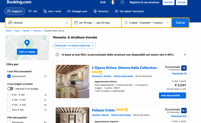 Se apriamo Booking.com oggi (11/05) il 98% degli annunci di qualsiasi tipo e il 99% degli appartamenti, risulta occupato. Di fatto, in tutto il territorio rimangono solo 6 appartamenti prenotabili, con un prezzo mediano a notte di €980.