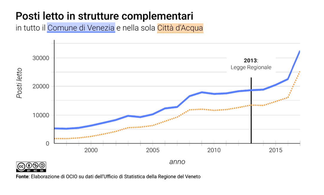 Dal 2000 ad oggi questo è l’andamento dei posti letti finalizzati a strutture ricettive complementari nel Comune di Venezia.