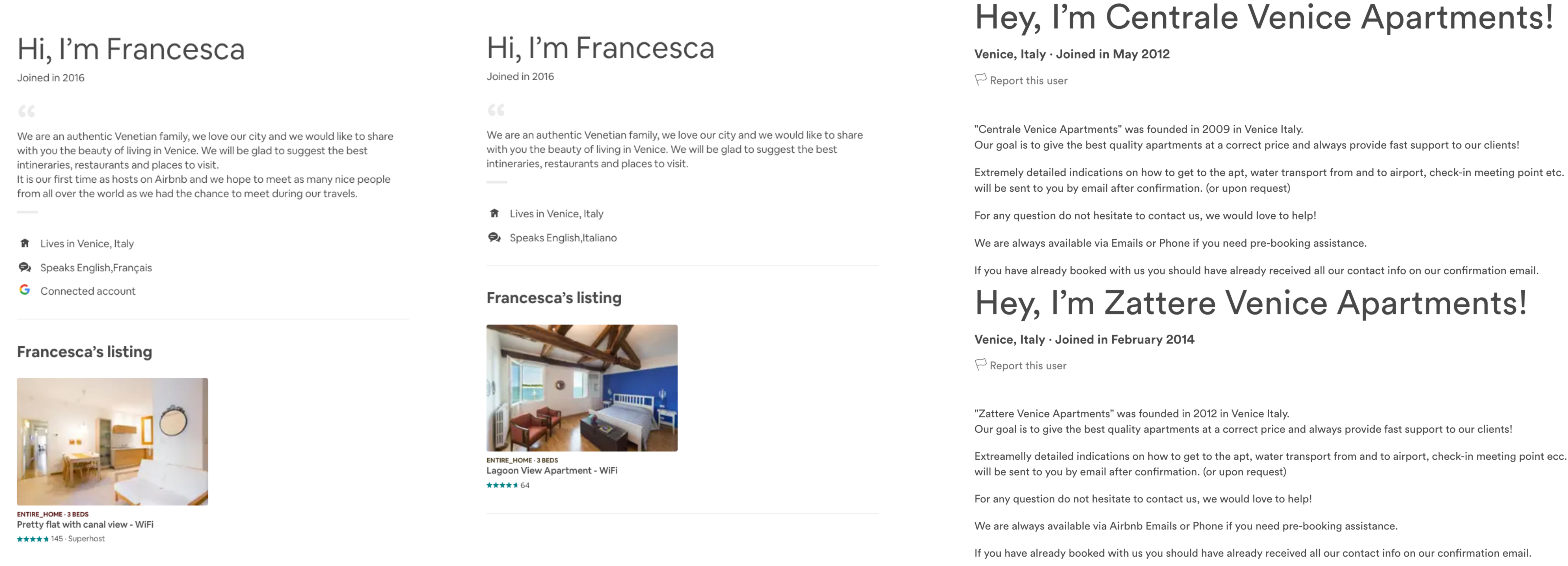 Questo dato è inoltre una probabile sottostima, poichè non sono stati conteggiati i diversi casi in cui un host apre un profilo diverso per ogni annuncio. Alcuni di questi sono evidenti dal fatto che alcune descrizioni di host diversi o descrizioni di appartamenti di host diversi sono pressoché identiche.