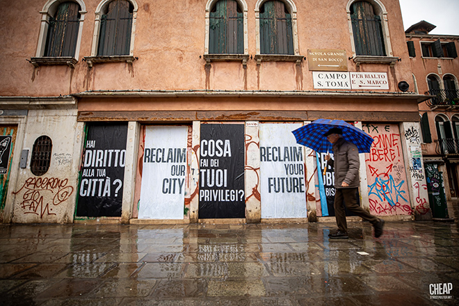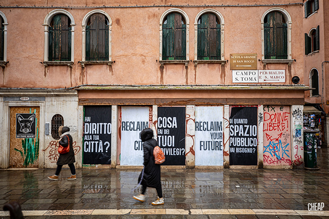 Evidentemente l’invito lanciato da CHEAP a Venezia a “Disobbedire con generosità” (dal titolo del libro del progetto di arte pubblica recentemente edito da People) è stato colto: a San Giacomo dell’Orio sul tavolato che circonda un cantiere, un poster di 20 metri si rivolge a chi attraversa il campo, chiedendo se pensa di avere diritto alla propria comunità e ricordando una cosa molto semplice – non saranno i soldi a salvare la città.