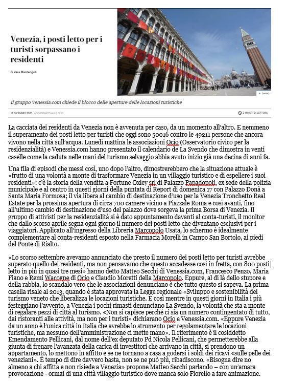 Lo scorso 9 settembre avevamo allertato l’opinione locale, nazionale e internazionale sul sorpasso del numero di residenti a Venezia da parte dei posti letto turistici. Qualche giorno dopo, il Comitato Patrimonio Mondiale dell’UNESCO prese la decisione di non inserire Venezia e la sua laguna nella Lista del Patrimonio Mondiale in Pericolo, nonostante le raccomandazioni dei suoi stessi esperti e organi consultivi.