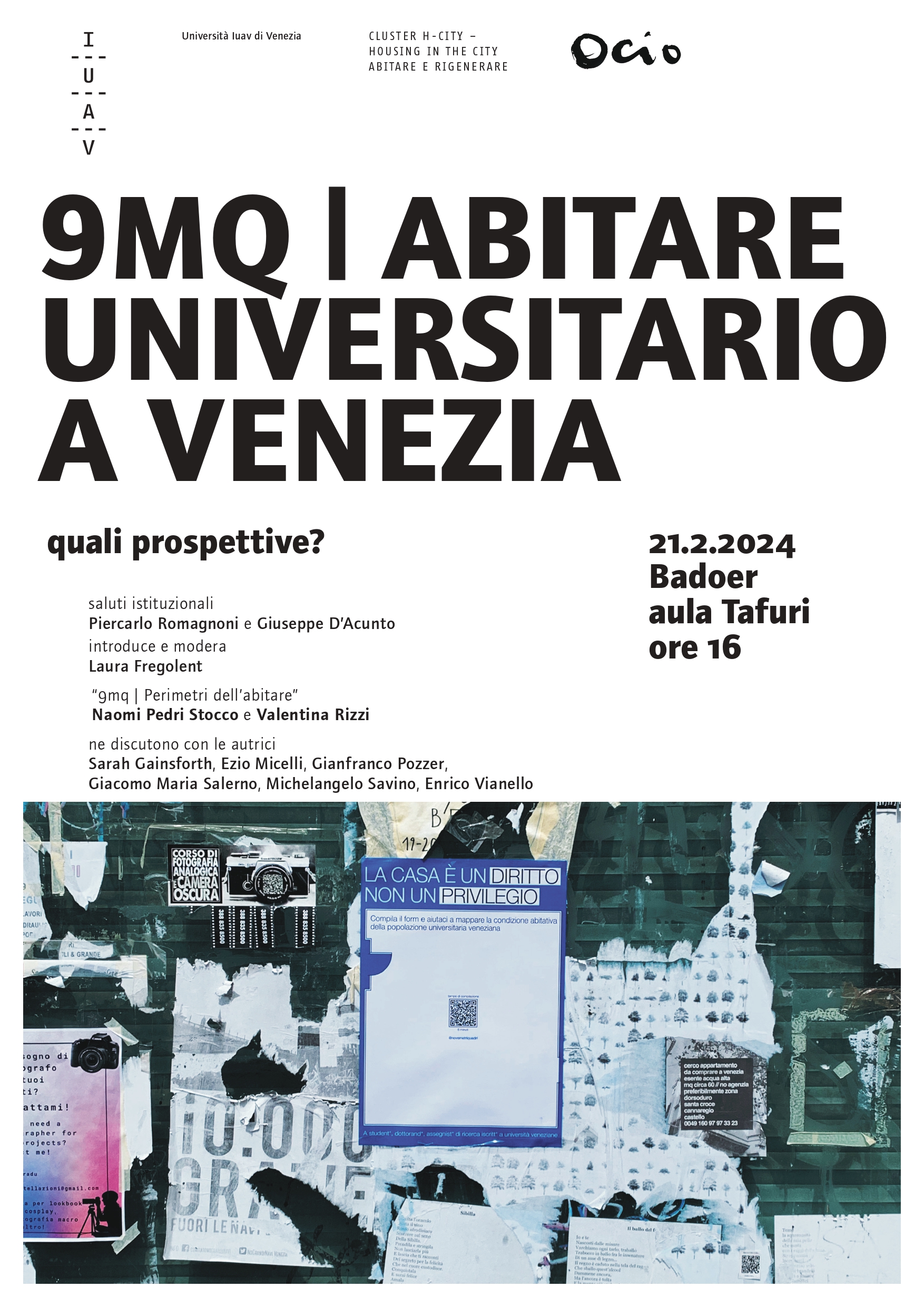 I dati emersi sono stati presentati all’Università IUAV di Venezia, presso l’Aula Tafuri di Palazzo Badoer, il 21 febbraio 2024 con la conferenza “9MQ | ABITARE UNIVERSITARIO A VENEZIA. Quali prospettive?” organizzata con la professoressa Laura Fregolent e promossa dal Cluster H-City (Housing in the City - abitare e rigenerare) e da OCIO (Osservatorio CIvicO sulla casa e la residenzialità a Venezia).