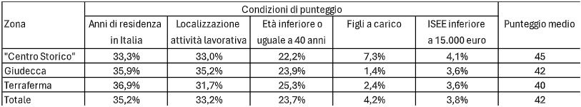 Nella Venezia insulare, la condizione di punteggio di gran lunga maggioritaria (oltre l’80%) è la presenza nel nucleo di almeno un componente residente da più di dieci anni in Italia. Anche i punteggi per lavoro in “Centro Storico”, Comune e Città metropolitana sono frequenti, intorno al 60% delle domande in graduatoria.