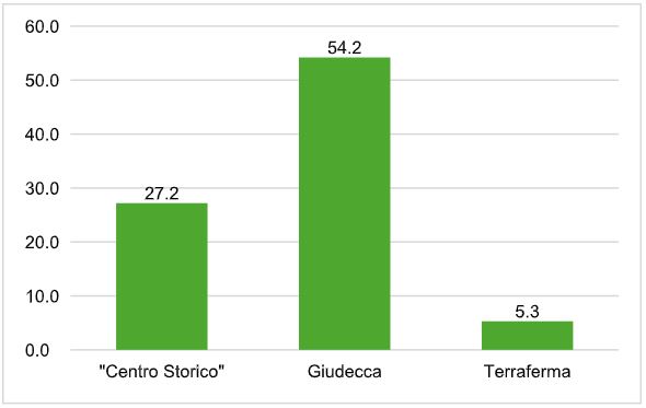 Questa motivazione spiegherebbe la prevalenza dei richiedenti alloggio nella Città insulare, dove il mercato dell’affitto privato di lungo termine è sostanzialmente scomparso, rispetto alla Terraferma; un dato che diventa ancor più evidente se ponderato rispetto alle famiglie residenti al 31/12/2023: in “Centro Storico” l’indicatore del numero di domande presentate ogni 1.000 nuclei è pari a 27, contro il 5,4 della Terraferma. Si arriva ad un massimo di 54 richiedenti per mille famiglie residenti nell’isola della Giudecca.
