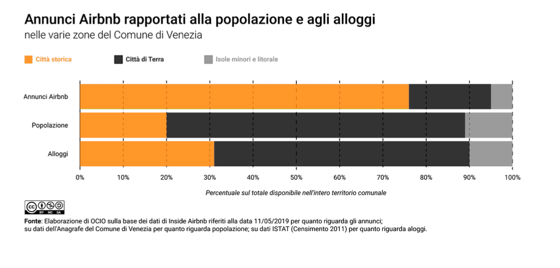 Molti di questi alloggi sono pubblicizzati nella piattaforma Airbnb che per il Comune di Venezia conta conta 8.277 annunci. Di questi, 3946 sono attivi a ritmo sostenuto, con almeno una recensione negli ultimi 6 mesi e una stima di 90 notti l’anno occupate. Airbnb si presenta come una piattaforma di “turismo sostenibile”: gli ospiti vivono a stretto contatto con i locali condividendone gli spazi abitativi; chi ospita lo fa in maniera occasionale e non imprenditoriale. Nonostante questo: