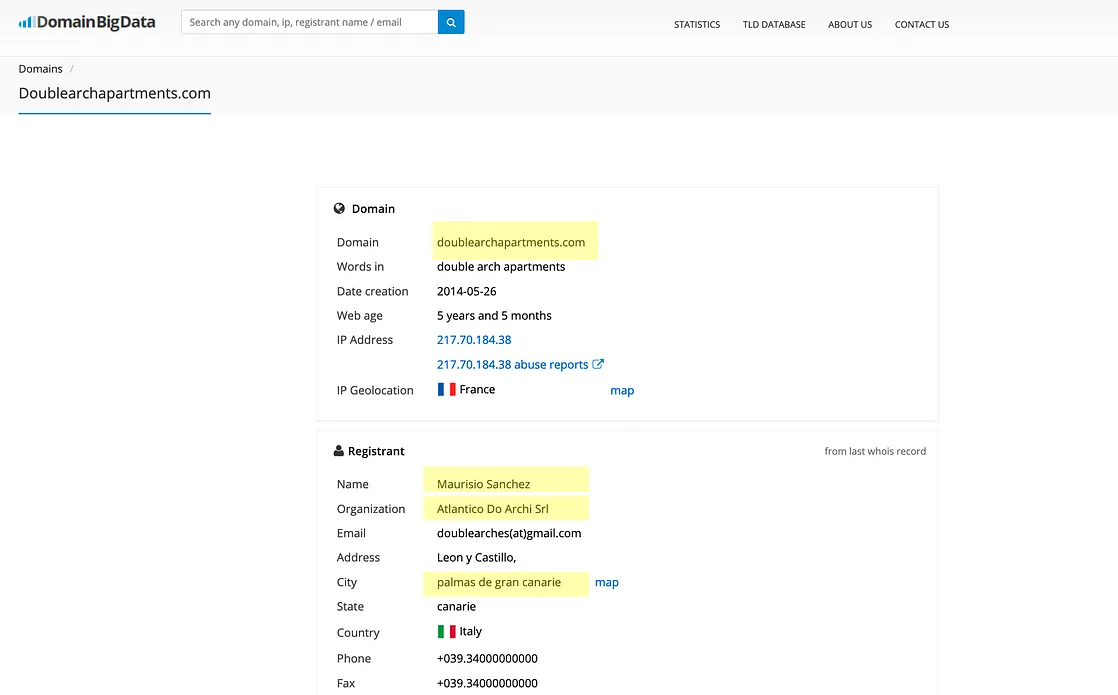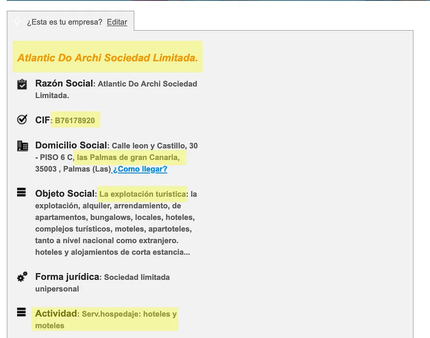 Se cerchiamo infatti nei registri WHOIS (che permettono di scoprire chi ha registrato un dominio di un sito web), scopriamo che il sito è stato registrato da un certo Maurisio Sanchez con sede alle Isole Canarie, per conto della Atlantico do archi. Finalmente possiamo associare all’Atlantic Do Archi Family & Group un nome ufficiale che compaia nel Registro Imprese. Solo che non è il Registro Imprese italiano, ma quello spagnolo: Maurisio Sanchez è un commercialista delle Canarie a cui il titolare di Atlantic do archi si è presumibilmente appoggiato per stabilire la sede della sua azienda.