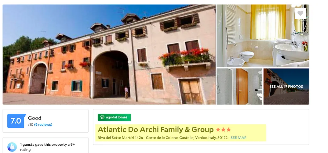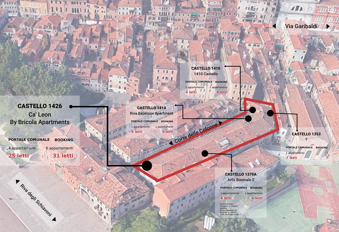 Torniamo a Corte delle Colonne, dove troviamo Ca’ Leon by Bricola Apartments: una struttura composta da ben 4 appartamenti per un totale di 25 posti letto, tutti gestiti attraverso il vantaggioso regime di locazione turistica. Bricola Apartments non ha una grande presenza online, una pagina Facebook quasi vuota, un indirizzo email e un sito in manutenzione. L’azienda gestisce però 13 appartamenti su Airbnb, per un totale di 64 posti letto. Cercando Ca’ Leon su vari siti per prenotazioni online, ci si accorge che Bricola Apartments e Ca’Leon sono collegati all’ “Atlantic Do Archi Family & Group”, un non meglio identificato soggetto che compare online con diversi altri nomi, come Double Arch Apartments. Tre profili Airbnb diversi riconducibili a questi nomi gestiscono una consistente porzione di locazioni turistiche a Castello:18 appartamenti, per un totale di 76 posti letto.
