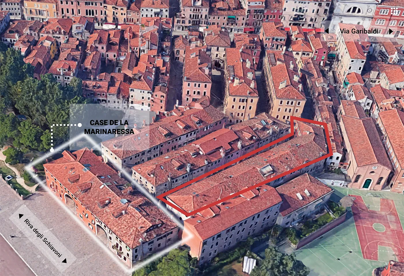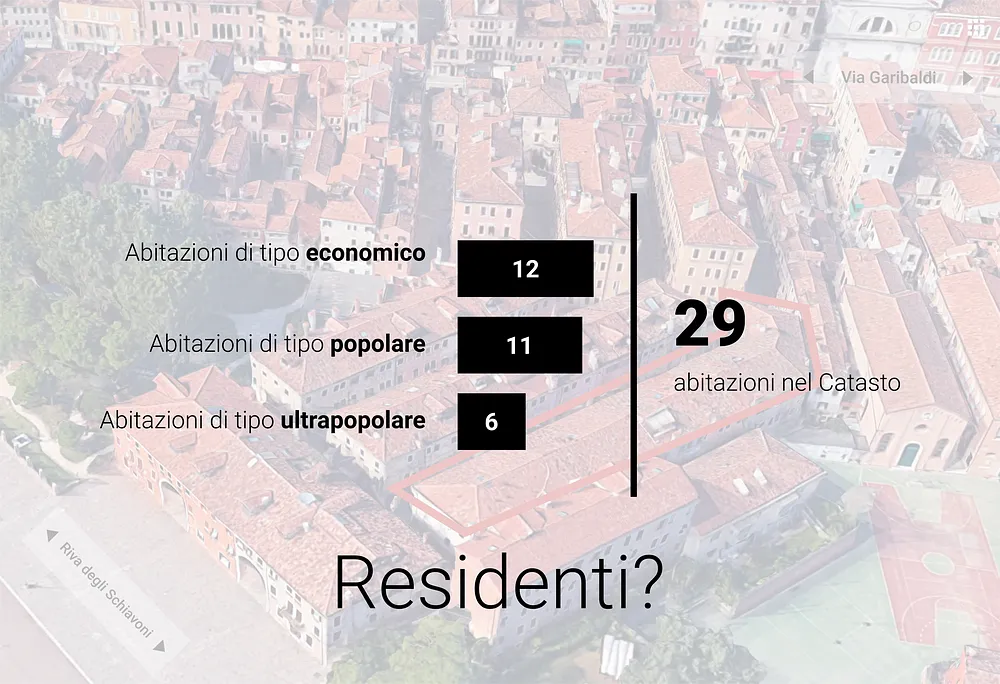 Che ne è di tutto questo oggi? Negli edifici pubblici di Quintavalle, amministrati dall’ATER, molti appartamenti sono chiusi e non assegnati: circa una 30ina secondo una ricerca fatta da OCIO assieme agli inquilini della zona. Tra quelli assegnati, la manutenzione è stata spessa fatta dagli stessi locatari. E attorno a Corte delle Colonne? Qui c’è una storia di Airbnb e locazioni turistiche che da Venezia… ci porta in mezzo all’Atlantico. Ma procediamo con calma e prendiamo in considerazione questo blocco di case qui. Al Catasto questo è registrato come l’solato 270420341 e risultano esserci 29 abitazioni. Quanti saranno i residenti?