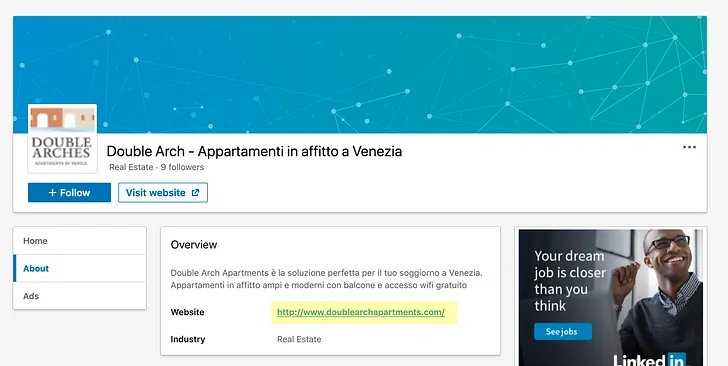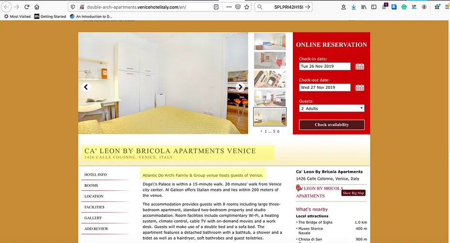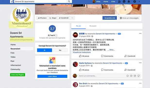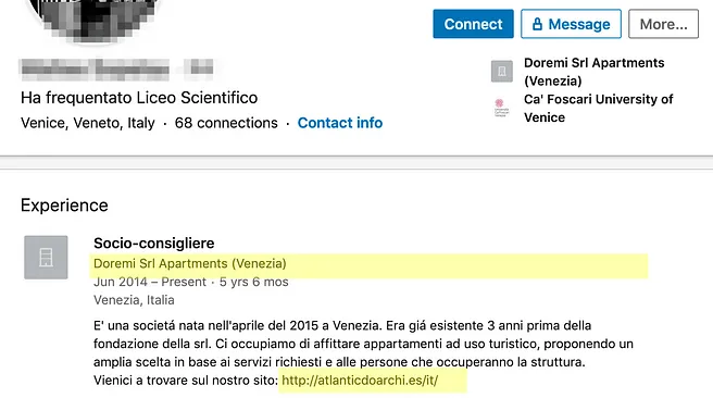 Nonostante tutta quest’attività, Atlantic Do Archi Family & Group non ha un sito web ufficiale né compare nel Registro Imprese. Una ricerca sui social ci porta alla pagina Facebook di Doremi srl, che ha nell’immagine profilo il nome “Atlantic do Archi” e nel nome utente “Double Arch Apartments”. Cercando a grappolo Doremi srl, troviamo anche il profilo LinkedIn di Double Arch — Appartamenti in affitto a Venezia, associato a un sito web inesistente che sarà però la chiave per scoprire qualcosa di utile sull’ “Atlantic Do Archi Family & Group”.