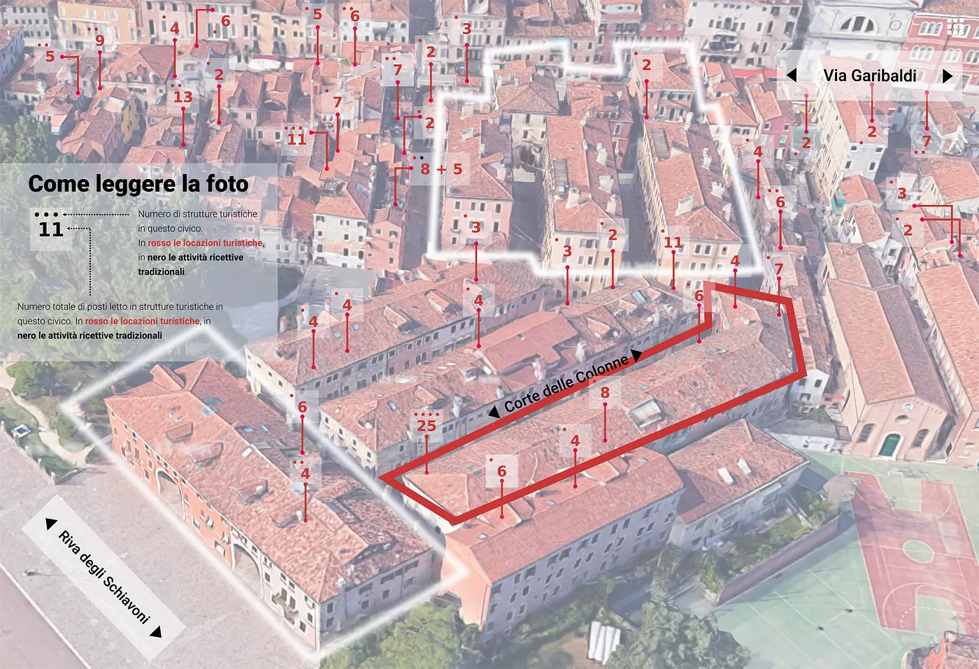 Allargando lo sguardo a tutto il sestiere, è possibile capire a fondo la pervasività del fenomeno delle locazioni turistiche a Castello. Di seguito una mappa di tutti gli edifici con almeno una struttura ricettiva: pochi si salvano e persino gli inquilini ERP, negli stabili in cui parte degli alloggi è diventato privato, si ritrovano a condividere lo stesso tetto con i turisti degli Airbnb.