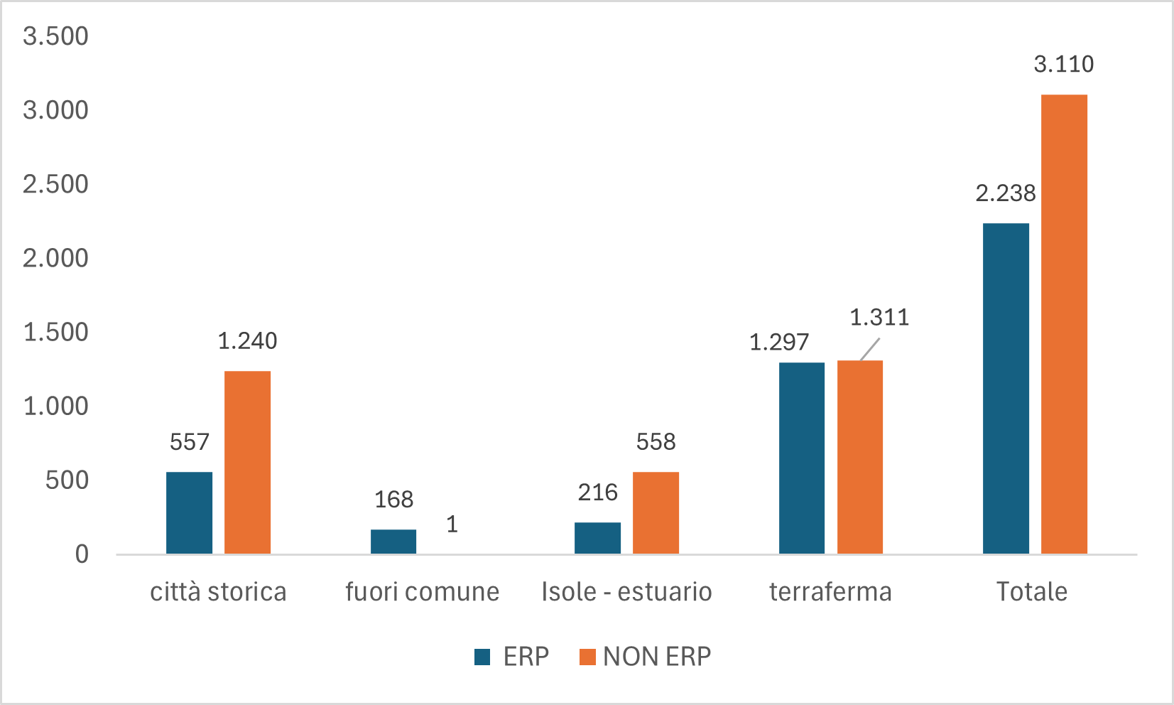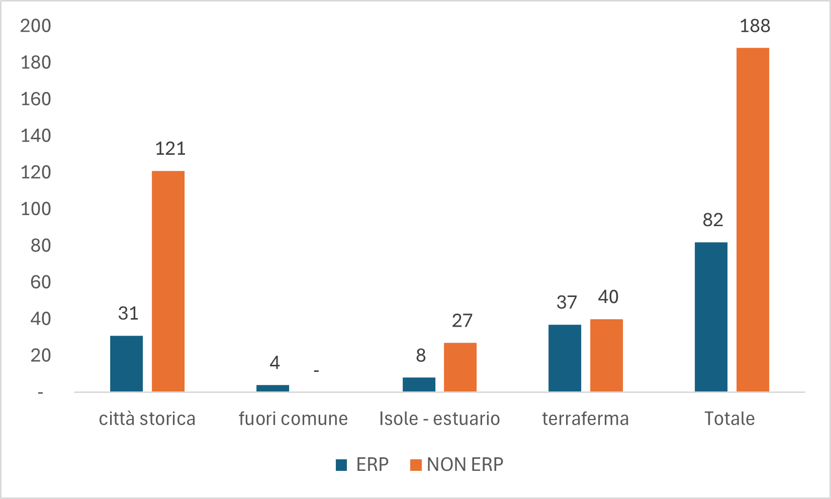 La quota più consistente di alloggi “Non ERP” si registra nella Città Storica e nelle Isole-Estuario con un’incidenza pari al 70%: qui, infatti, si concentra maggiormente il patrimonio residenziale realizzato non a totale carico dello Stato, assoggettabile quindi alla deroga regionale.