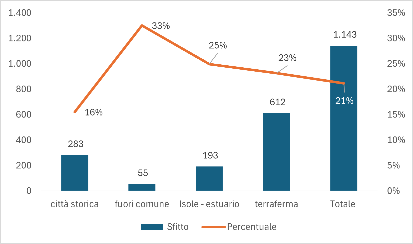 Nella Città Storica dove i finanziamenti della Legge Speciale per Venezia hanno garantito interventi di manutenzione e recupero più continuativi, il patrimonio sfitto scende al 16%.
